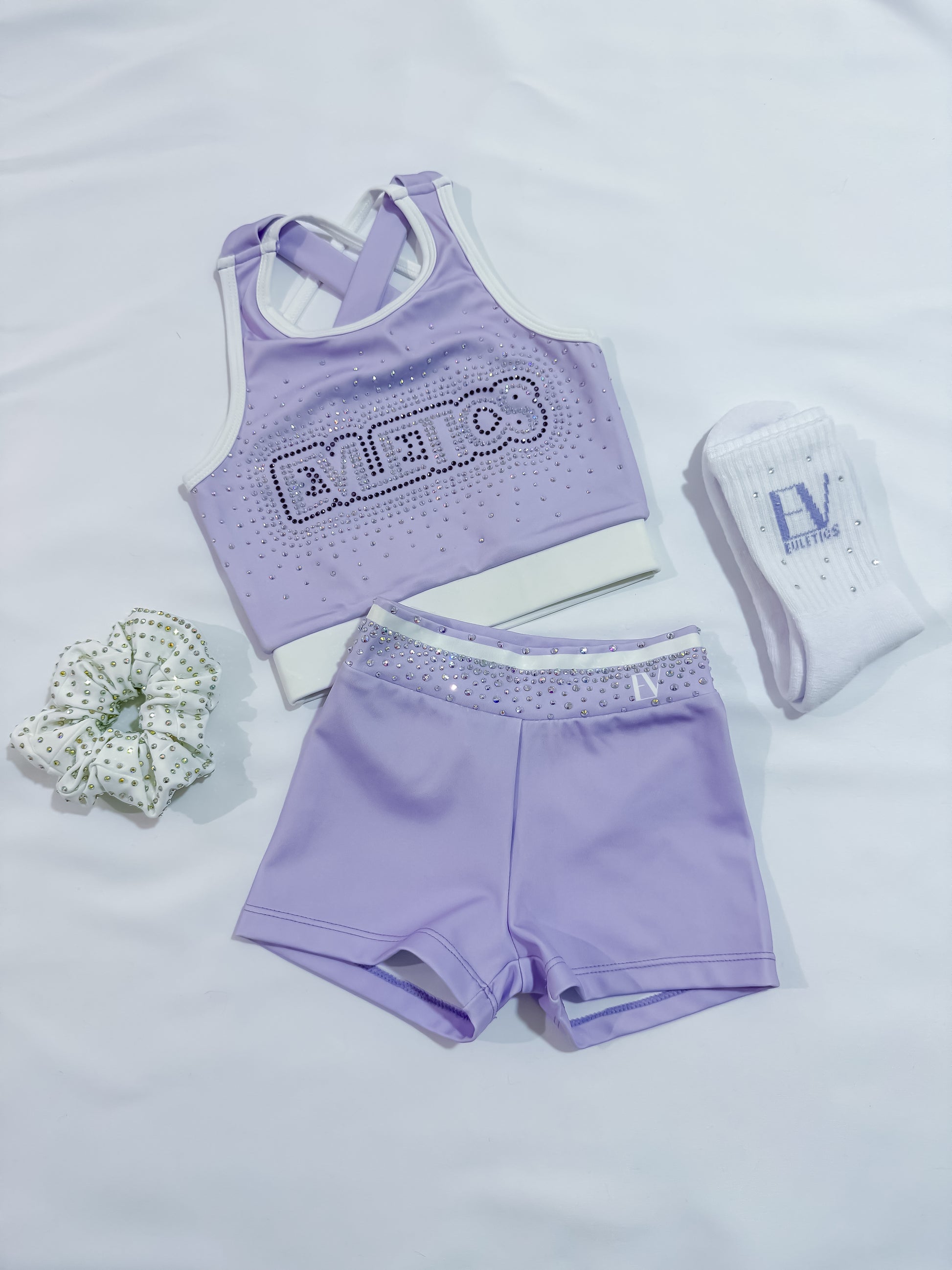 Crafted in a premium lilac hue with a sporty silhouette, these shorts are built to keep up with every leap, tumble, and sprint. The high-stretch fabric moves with you, while the sleek rhinestone finish adds a polished edge to any activewear look.