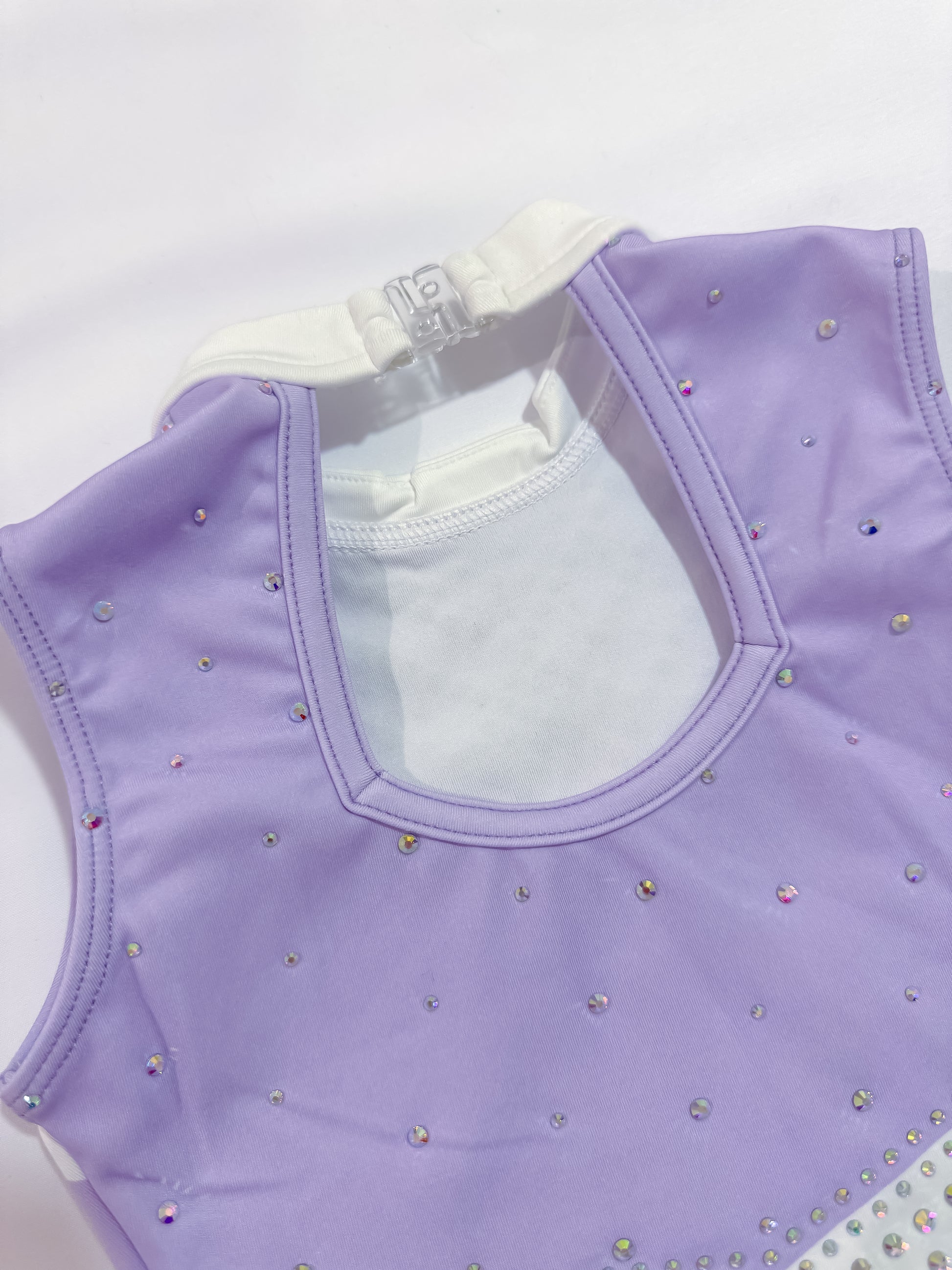 The Luxe Lilac Leotard combines strong lines with subtle shine, designed for those who demand both performance and style. Featuring a sculpted silhouette and elegant rhinestone detailing front and back, this piece moves with you through every routine.