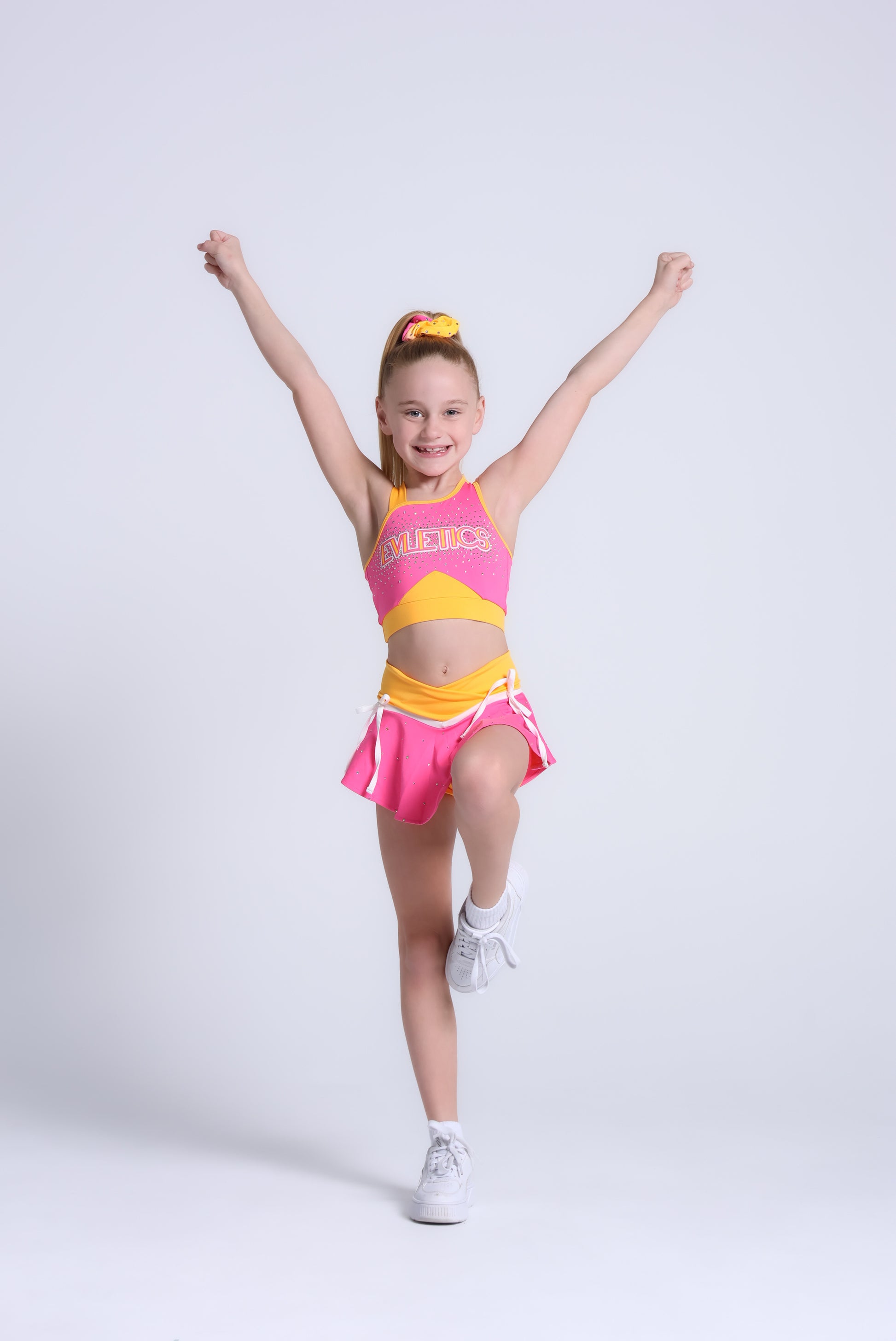 Designed in signature Sunset pink, it pairs perfectly with the matching Sports Crop for a full power set. A crossover waistband adds dynamic shape and secure comfort, while rhinestone accents and delicate bow details bring signature sparkle and charm. Inner shorts provide confidence on the move so kids can focus on shining, not adjusting.